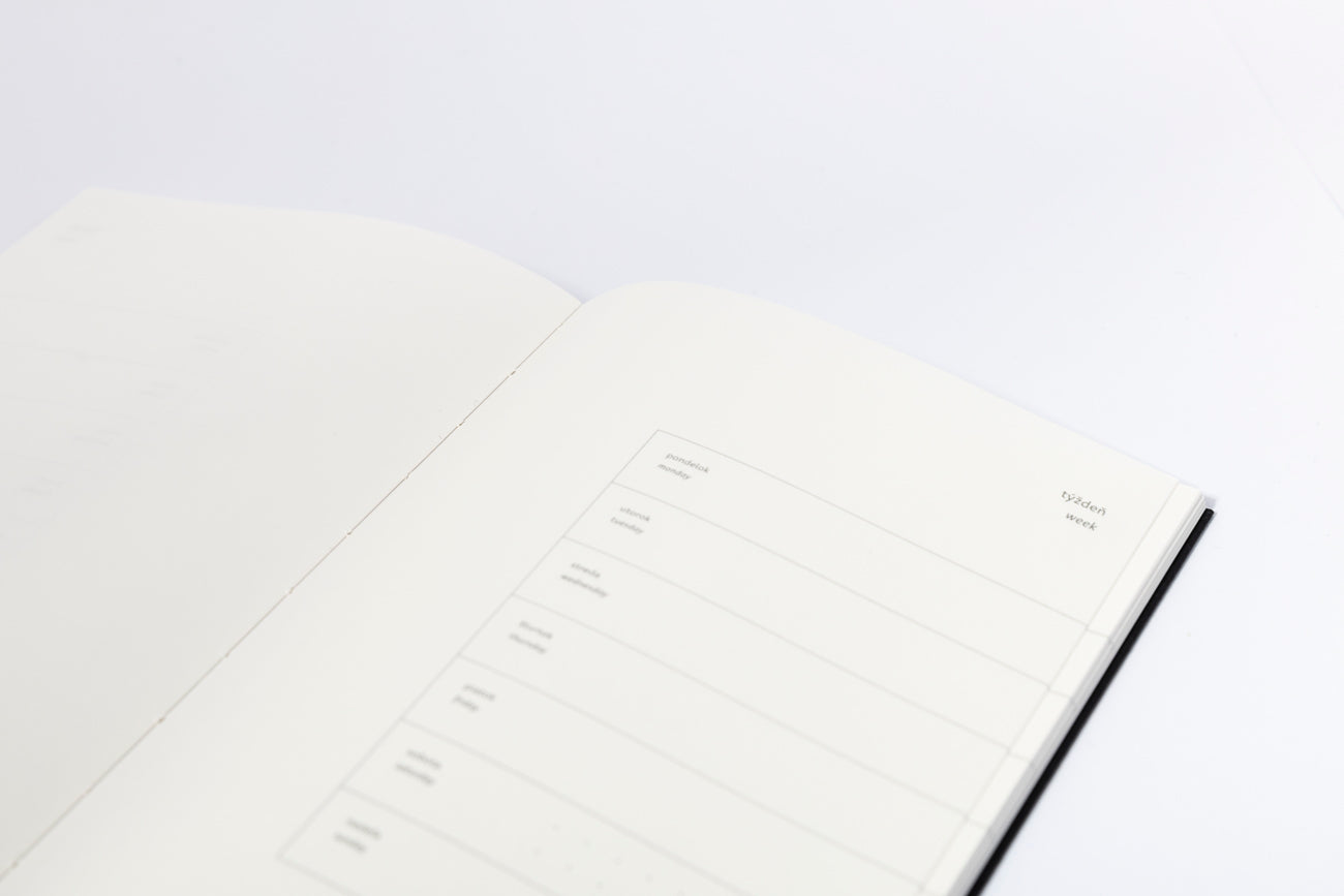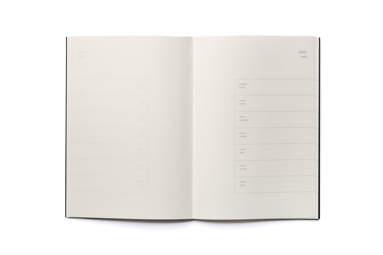 Dvojjazyčný bezdátumový diár v slovensko–anglickom prevedení. Jednoduchý na obálke a jednoduchý aj vo vnútri. Strohá sadzba obmedzená len na tie najnutnejšie informácie. A veľké plochy prázdneho miesta, ktoré obsiahnu Vaše pracovné/osobné zápisky či skice.