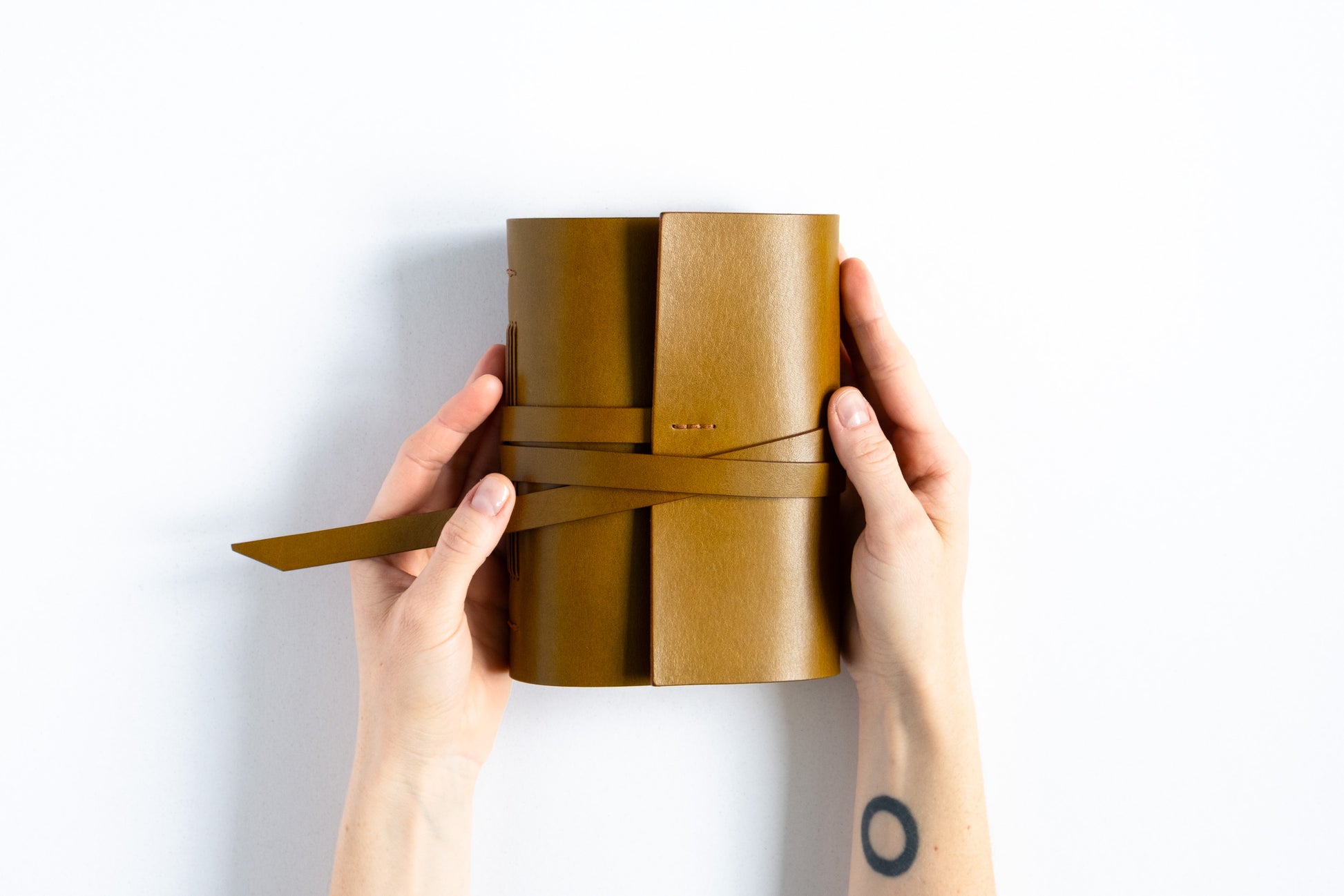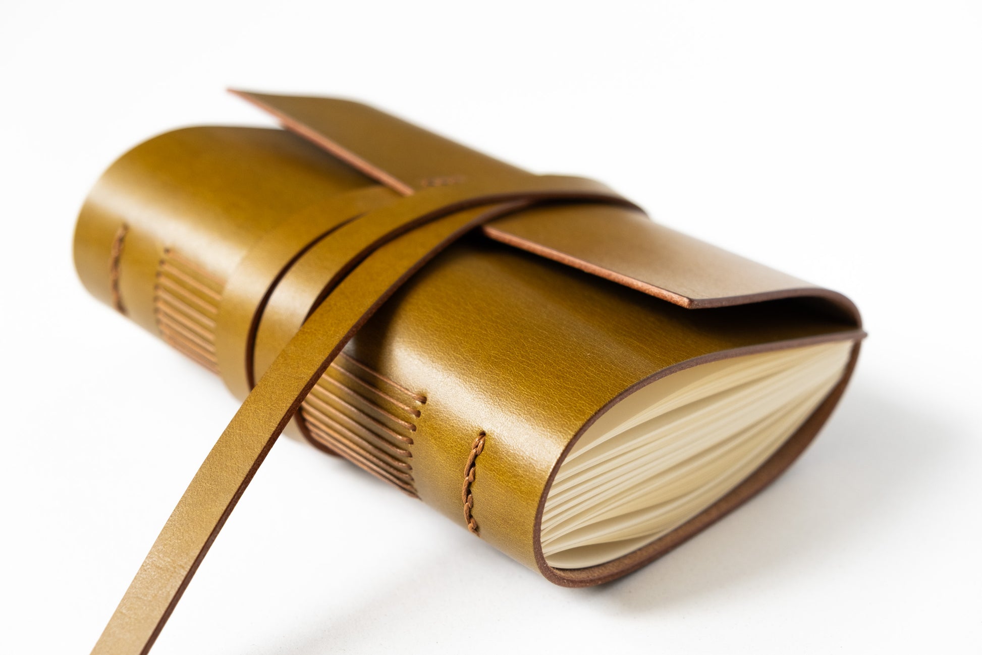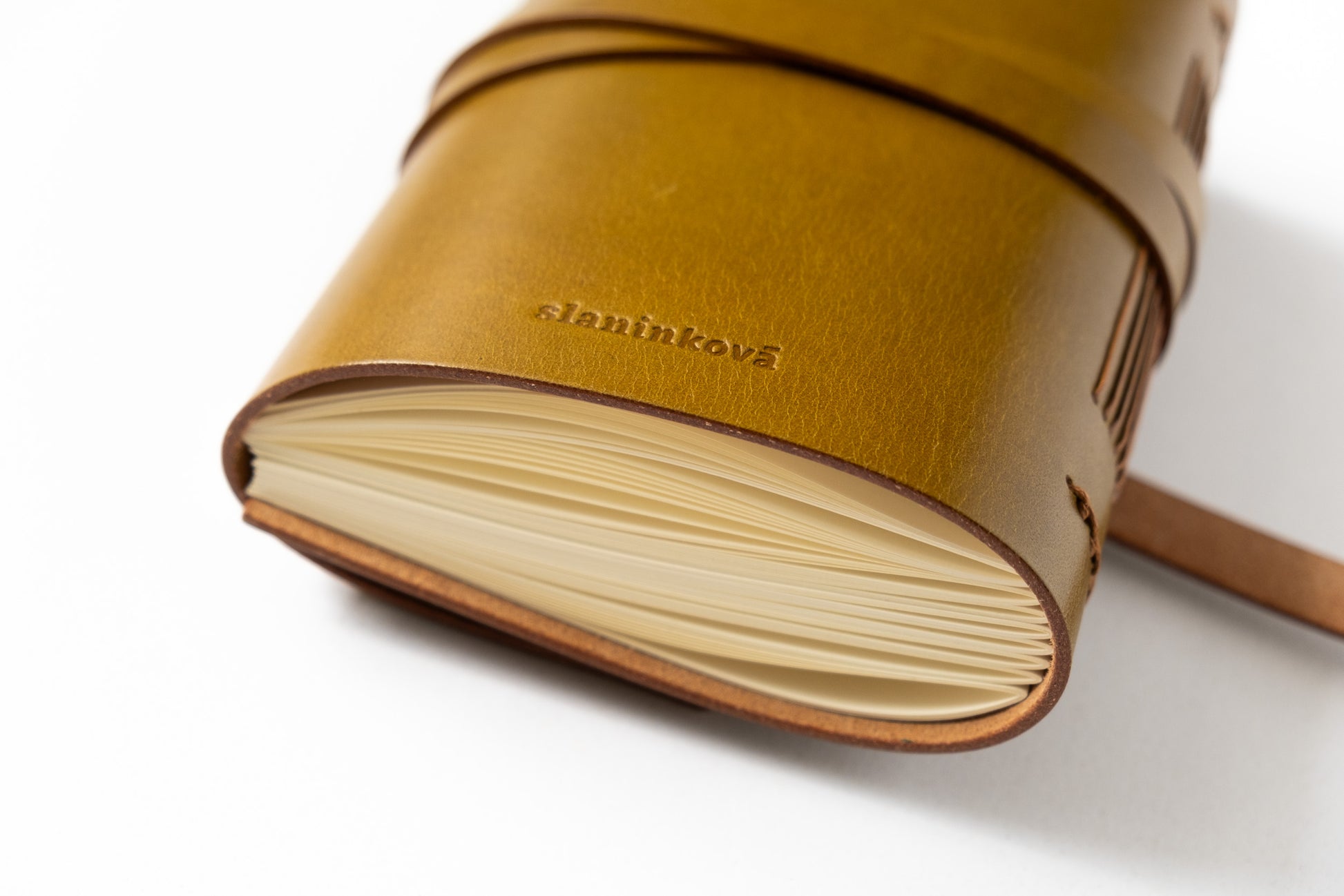 Koža na zápisníku má kari farbu (žlto-zelenú) a je mierne lesklá. Jej povrch nie je homogénny – na každom kuse je vidieť iné vrásnenie kože, zmenu odtieňu farby alebo iné nedokonalosti, ktoré sú typické pre pravú kožu.