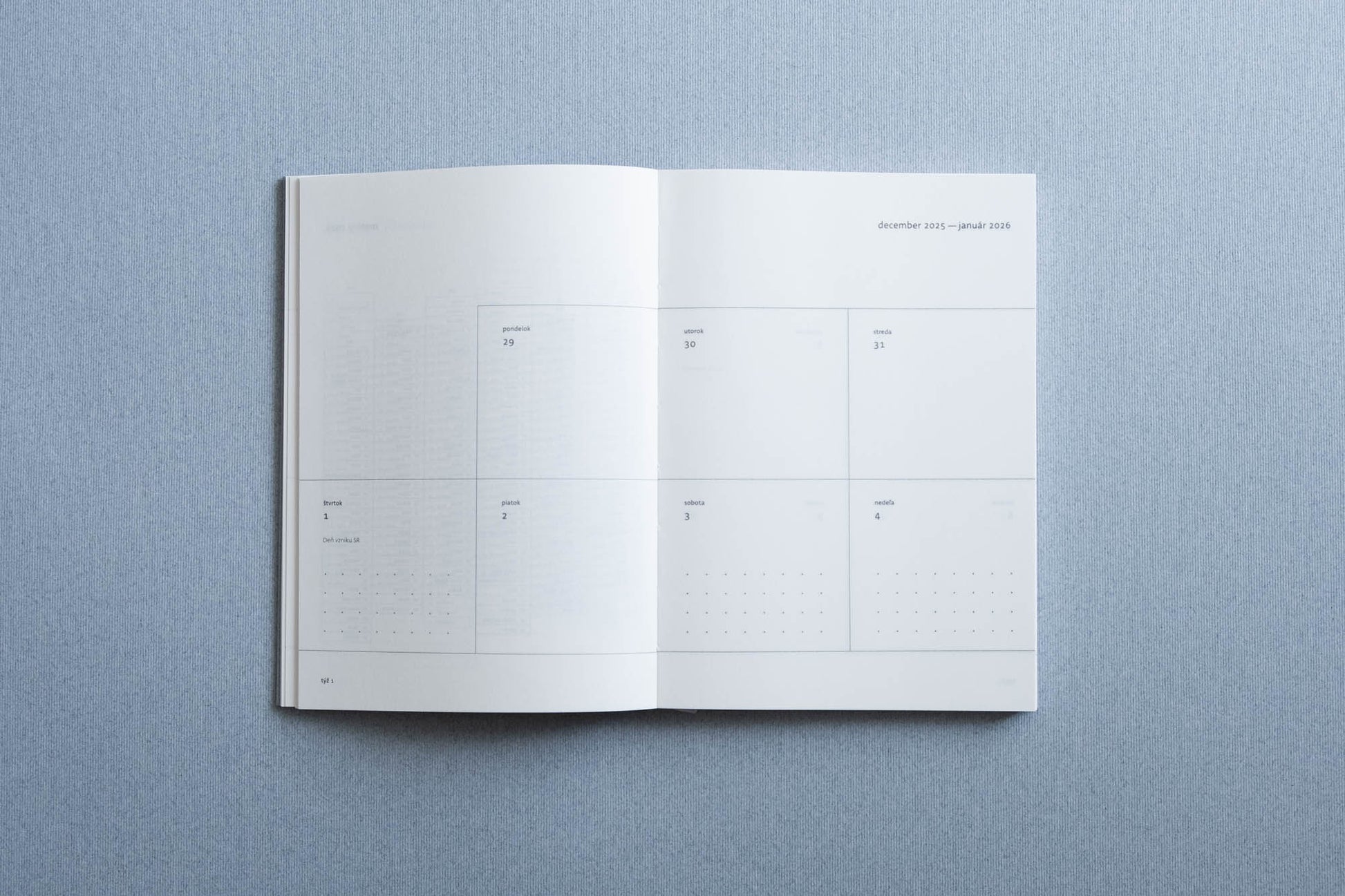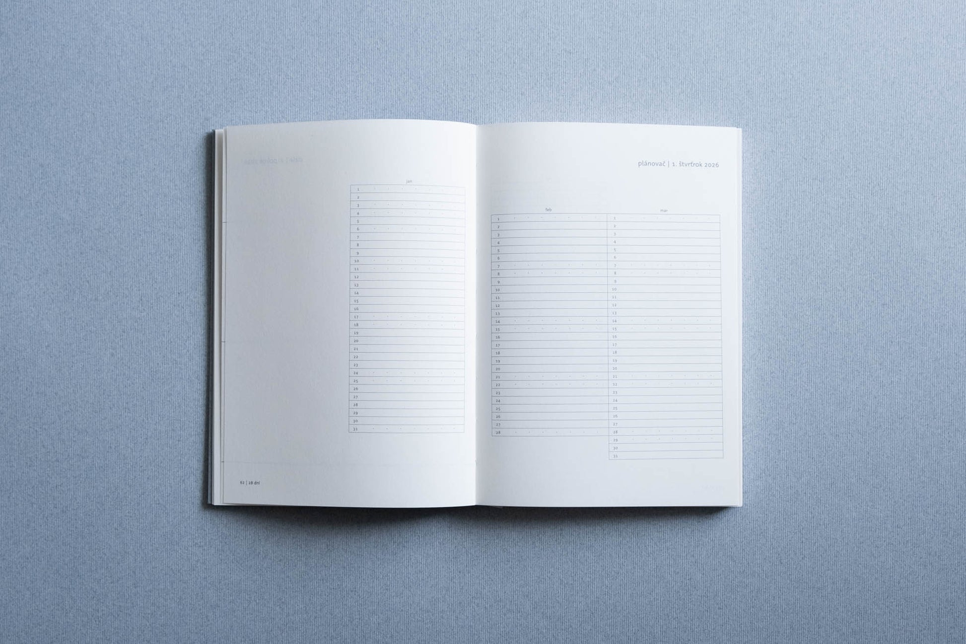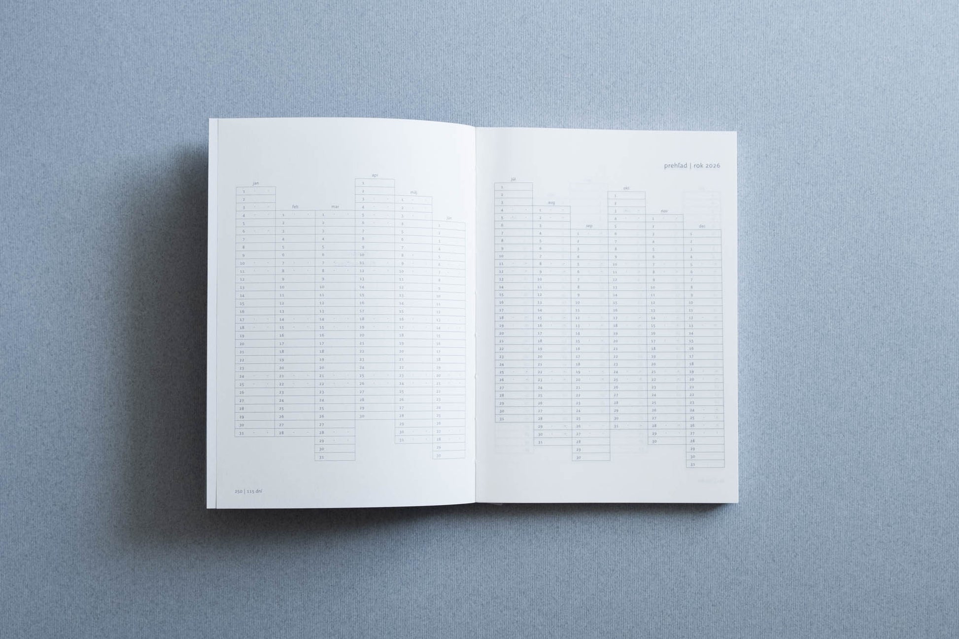Jednoduchý na obálke a jednoduchý vo vnútri. Strohá sadzba obmedzená len na tie najnutnejšie informácie. A veľké plochy prázdneho miesta, ktoré obsiahnu Vaše zápisky či skice. Väzba otvárateľná úplne na plocho je samozrejmosť.
